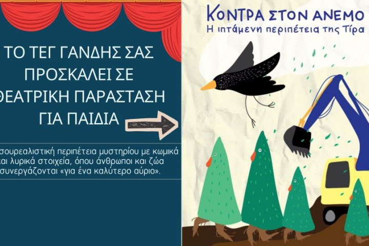 Το ΤΕΓ Γάνδης ανεβάζει την θεατρική παράσταση για παιδιά, «Κόντρα στον άνεμο: Η ιπτάμενη περιπέτεια της Τίρα». Πρόκειται για μια σουρεαλιστική περιπέτεια μυστηρίου με κωμικά και λυρικά στοιχεία, όπου άνθρωποι και ζώα συνεργάζονται για ένα καλύτερο αύριο.