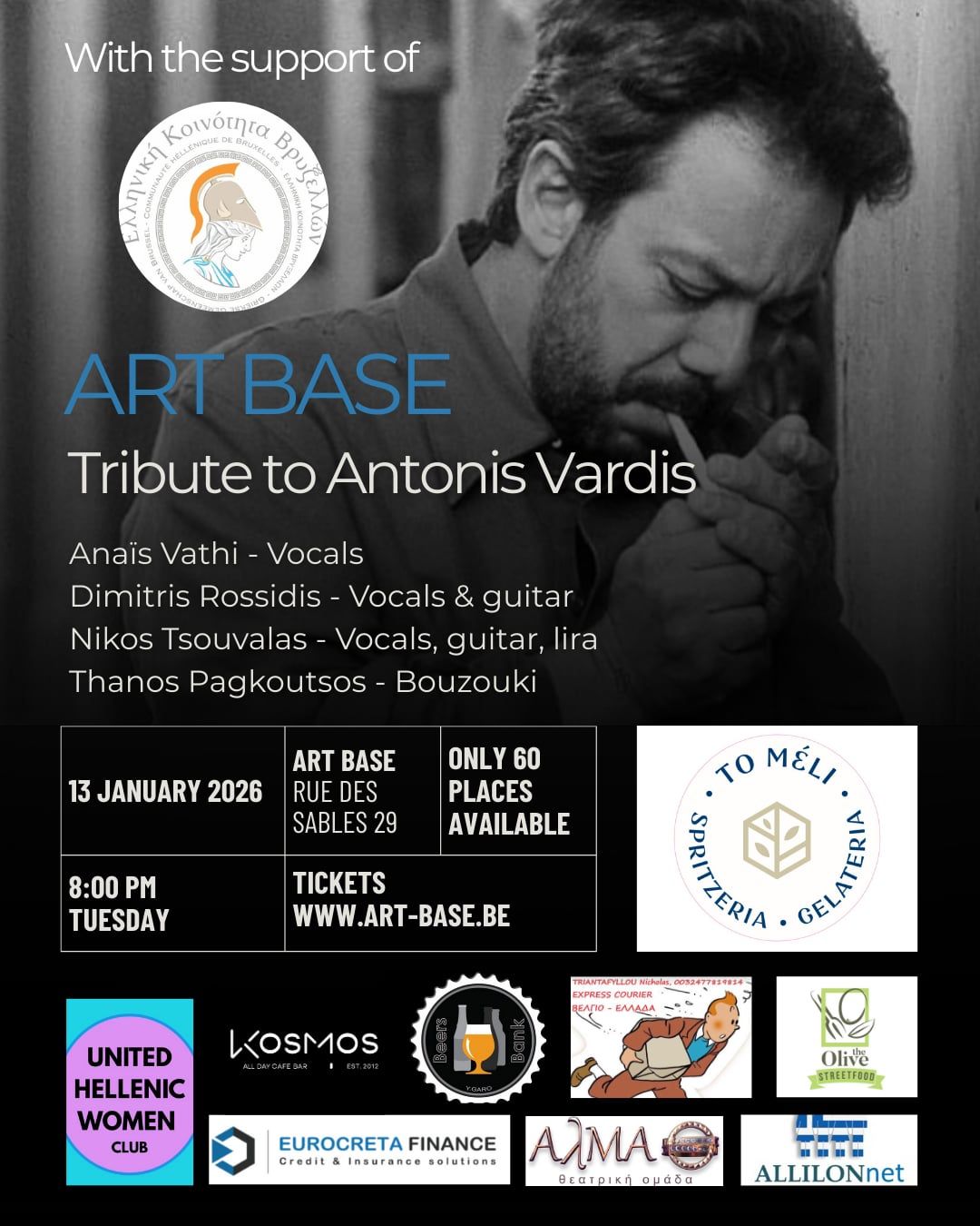 Το Art Base και η Ελληνική Κοινότητα Βρυξελλών παρουσιάζουν μια ξεχωριστή συναυλία-φόρο τιμής αφιερωμένη σε έναν από τους σημαντικότερους και διαχρονικότερους συνθέτες της ελληνικής λαϊκής μουσικής, τον Αντώνη Βαρδή.