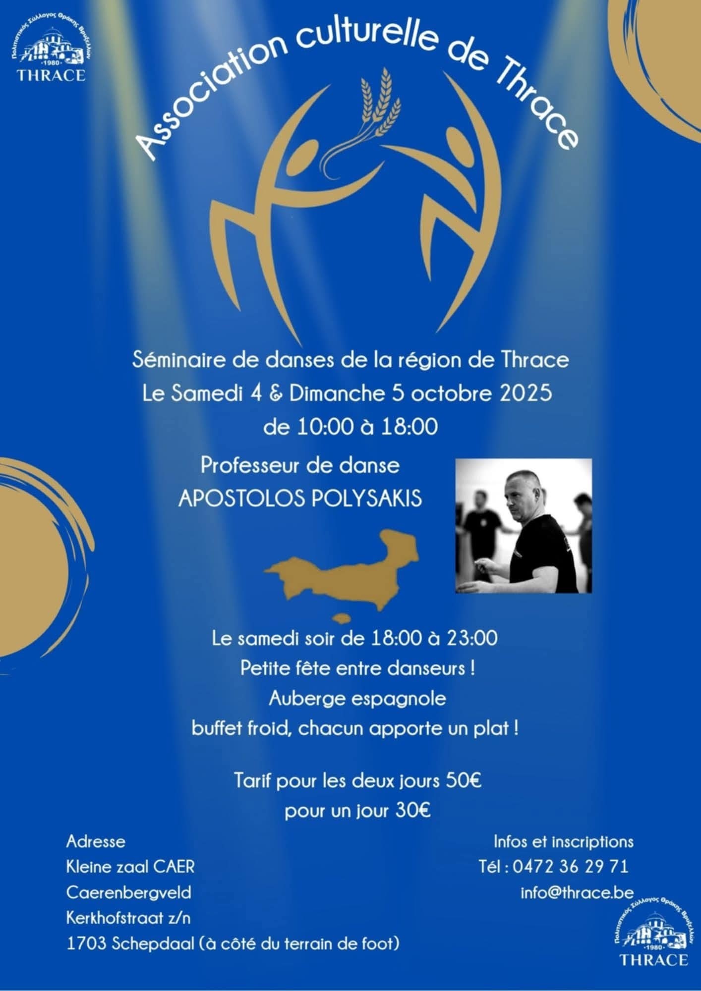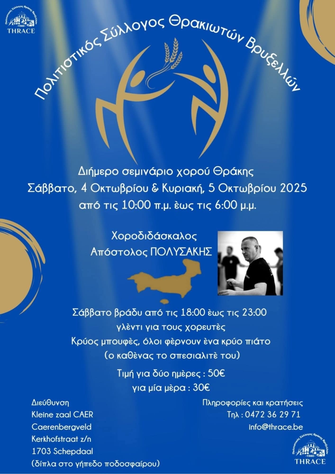 Ο Πολιτιστικός Σύλλογος Θρακιωτών Βρυξελλών προσκαλεί το κοινό στο Διήμερο Σεμινάριο Χορού Θράκης, το Σάββατο 4 και την Κυριακή 5 Οκτωβρίου 2025, από τις 10:00 το πρωί έως τις 18:00 το απόγευμα.
