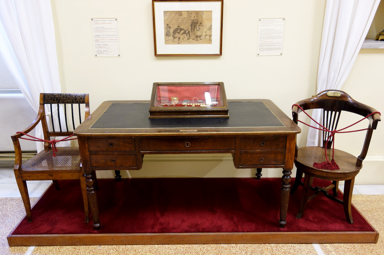 Το γραφείο και το κάθισμα του Ιωάννη Καποδίστρια όπως εκτίθενται στο Εθνικό Ιστορικό Μουσείο.