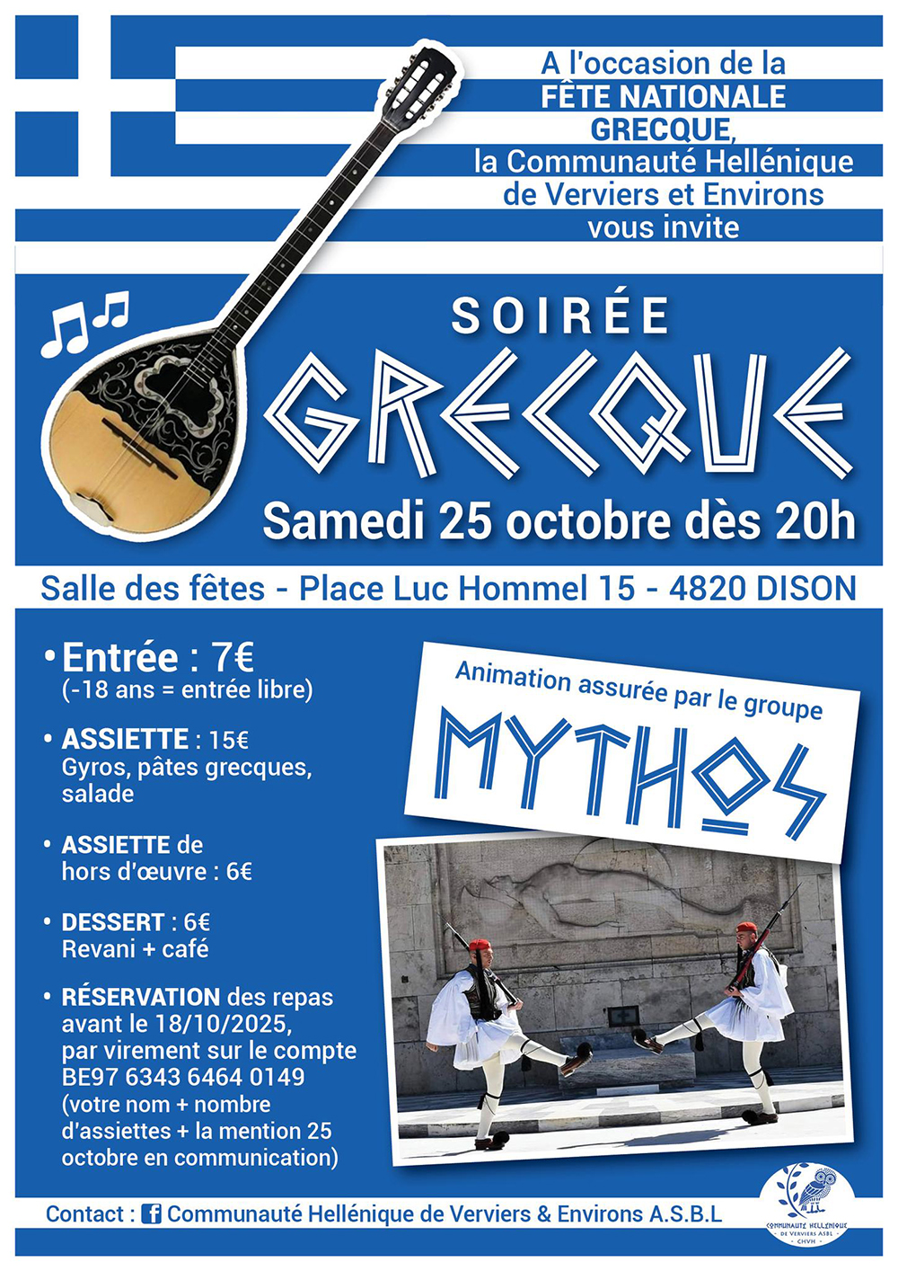 La Communauté Hellénique de Verviers et Environs invite le public à une soirée bouzoukia le samedi 25 octobre, à l’occasion de la fête nationale grecque. L’événement se tiendra à la salle des fêtes de la Place Luc Hommel 15, 4820 Dison, à partir de 20h.