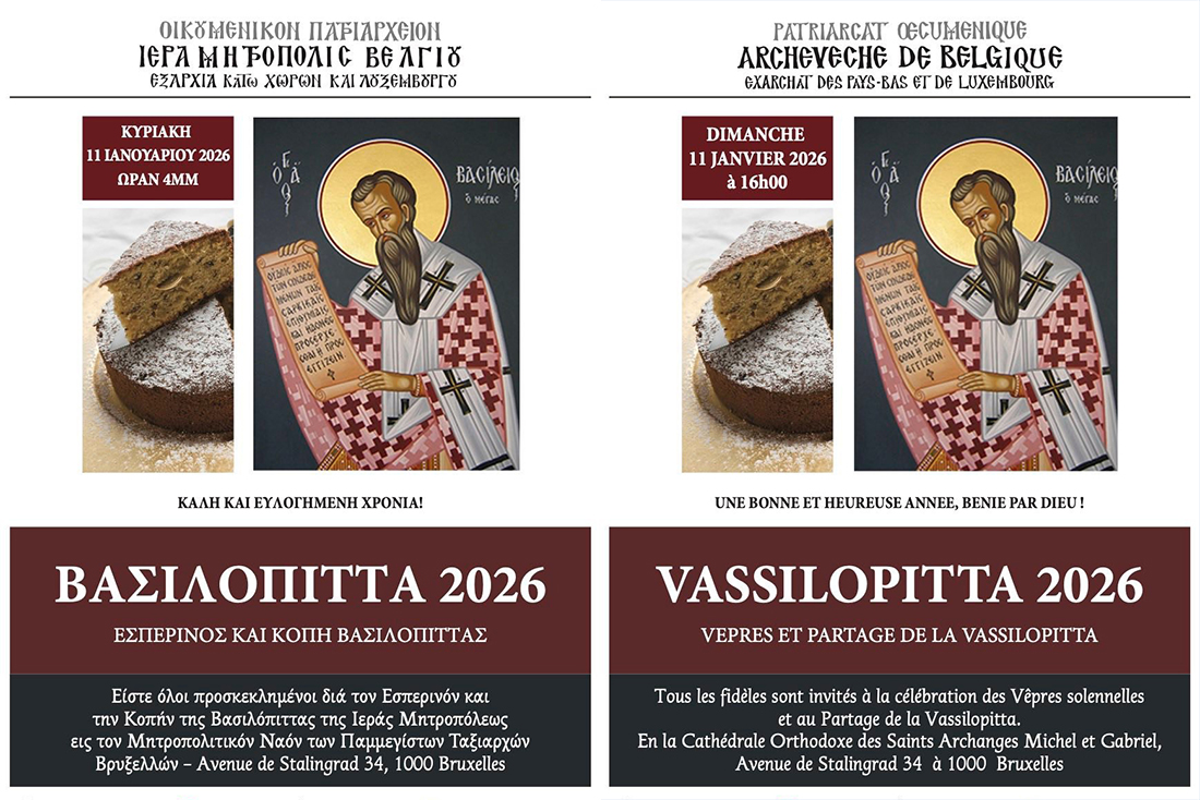 Με την έναρξη του νέου έτους, η Ιερά Μητρόπολη Βελγίου, Εξαρχία Κάτω Χωρών και Λουξεμβούργου, απευθύνει πρόσκληση προς τους πιστούς για την καθιερωμένη εκδήλωση του Εσπερινού και της Κοπής της Βασιλόπιτας, η οποία σηματοδοτεί πνευματικά και κοινοτικά την είσοδο στο έτος 2026.