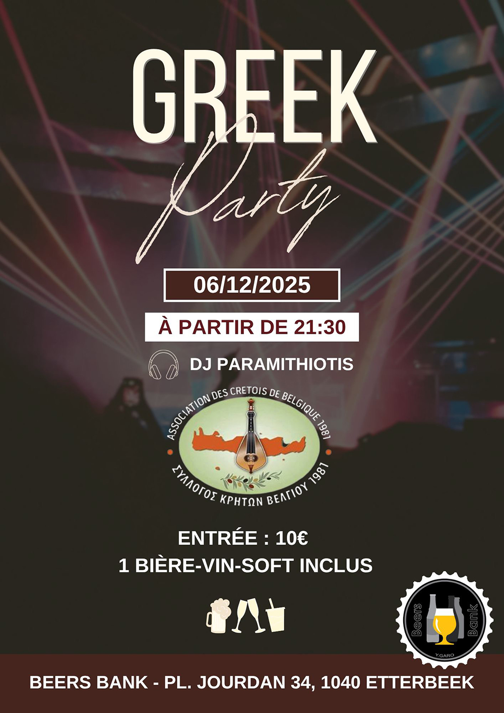 O Σύλλογος Κρητών Βελγίου διοργανώνει και μας προσκαλεί στις 06 Δεκεμβρίου 2025, από τις 21:30, στο Beers Bank, για μια ανεπανάληπτη ελληνική βραδιά με τον DJ Paramithiotis στα deck.