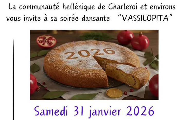 La communauté hellénique de Charleroi et environs organise, le samedi 31 janvier 2026, sa traditionnelle soirée dansante à l’occasion de la Vasilopita, la galette du Nouvel An grec. L’événement débutera à 20h00 et se tiendra au Centre Culturel de Couillet, rue Emile Vandervelde, 6010 Couillet.