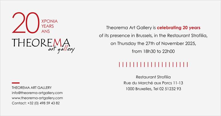 La galerie Theorema Art Gallery célèbre cette année un moment important : ses 20 ans de présence continue à Bruxelles. À l’occasion de cet anniversaire, elle organise une soirée exceptionnelle le jeudi 27 novembre 2025, de 18h30 à 22h00, au restaurant Strofilia, situé en plein centre de la ville.