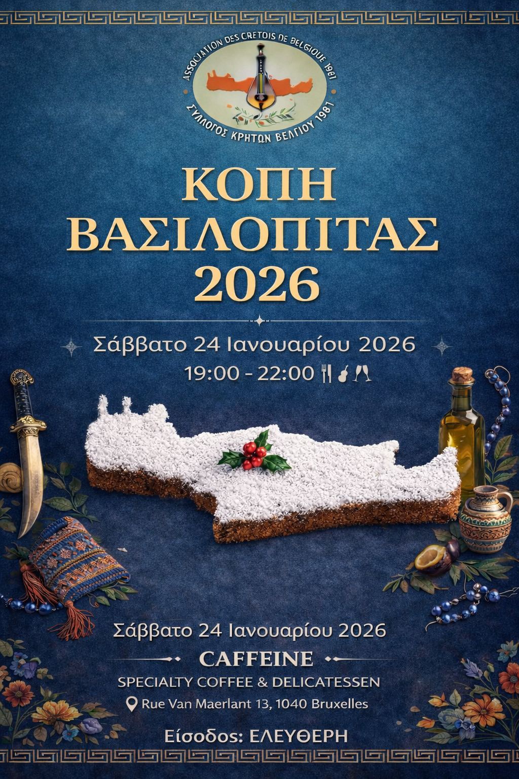 Ο Σύλλογος Κρητών Βελγίου προσκαλεί τα μέλη και τους φίλους του στην καθιερωμένη κοπή της βασιλόπιτας για το 2026, σε μια όμορφη βραδιά συνάντησης, ανταλλαγής ευχών και χαλαρής γιορτινής ατμόσφαιρας.