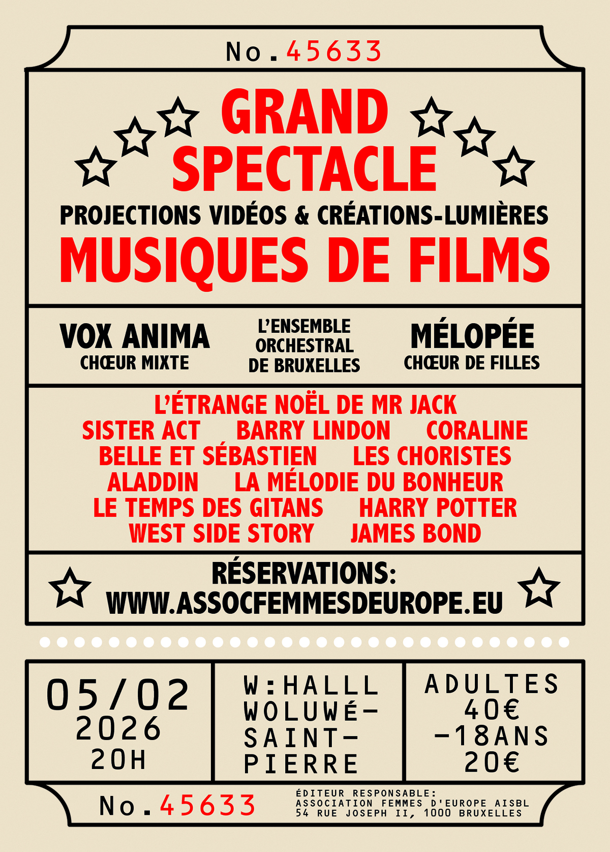 Την Πέμπτη 5 Φεβρουαρίου 2026, το W:Hall – Centre Culturel de Woluwe-Saint-Pierre μετατρέπεται σε μια μεγάλη κινηματογραφική σκηνή και υποδέχεται ένα εντυπωσιακό μουσικό γεγονός αφιερωμένο στις πιο αγαπημένες μουσικές του κινηματογράφου. Οι Irish and Multinational Groups προσκαλούν το κοινό σε ένα Grand Spectacle de Musiques de Films, ένα πολυδιάστατο θέαμα που συνδυάζει ζωντανή μουσική, προβολές βίντεο και ειδικούς φωτισμούς.