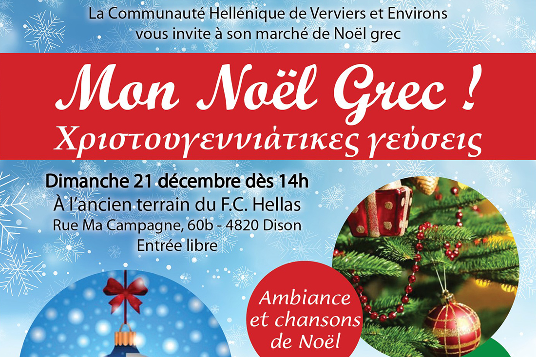 Alors que l’hiver s’installe et que Noël approche à grands pas, la Communauté Hellénique de Verviers & Environs vous invite chaleureusement à son 4e Marché de Noël grec. L’événement aura lieu le dimanche 21 décembre dès 14h, et promet une ambiance festive inspirée de la Grèce, pleine de parfums, de douceurs et de moments à partager. L’entrée est libre.