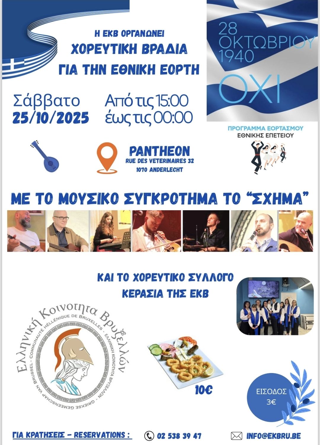 Η Ελληνική Κοινότητα Βρυξελλών σας προσκαλεί σε μια ξεχωριστή μουσικοχορευτική βραδιά για την Εθνική Εορτή της 28ης Οκτωβρίου 1940, το Σάββατο 25 Οκτωβρίου 2025, από τις 15:00 έως τις 00:00, στο Pantheon (Rue des Veterinaires 32, 1070 Anderlecht).