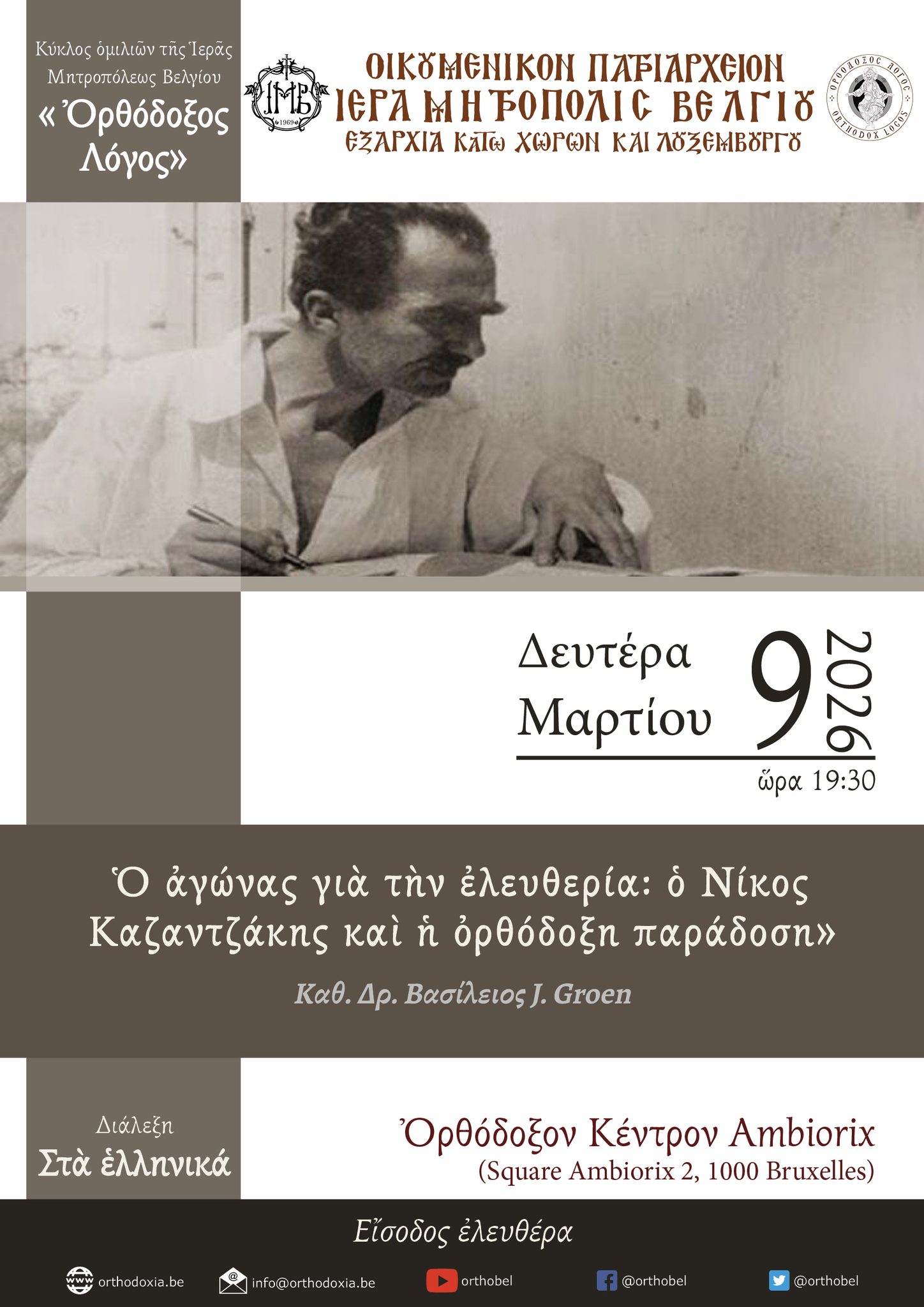 Η Ιερά Μητρόπολη Βελγίου, στο πλαίσιο του κύκλου ομιλιών «Ορθόδοξος Λόγος», διοργανώνει διάλεξη με θέμα «Ο αγώνας για την ελευθερία: ο Νίκος Καζαντζάκης και η ορθόδοξη παράδοση».