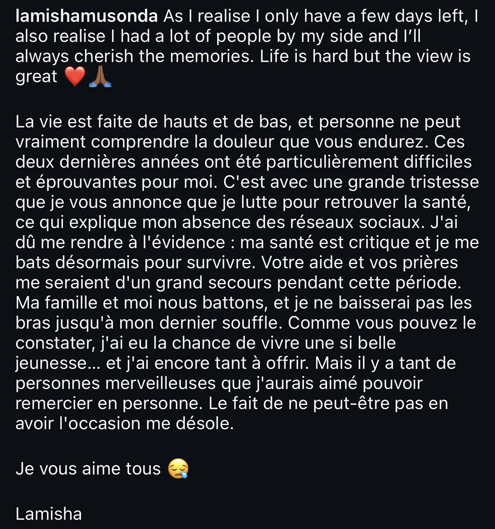 Ο Lamisha Musonda, 33 ετών, έκανε την ανακοίνωση την Τετάρτη 7 Ιανουαρίου 2026, χωρίς να αποκαλύψει τη φύση της ασθένειας από την οποία πάσχει. Στο μήνυμά του, αναφέρει ότι τα τελευταία δύο χρόνια ήταν ιδιαίτερα δύσκολα και ότι η κατάσταση της υγείας του έχει πλέον επιδεινωθεί σε κρίσιμο βαθμό, δηλώνοντας χαρακτηριστικά πως «παλεύει για να επιβιώσει».