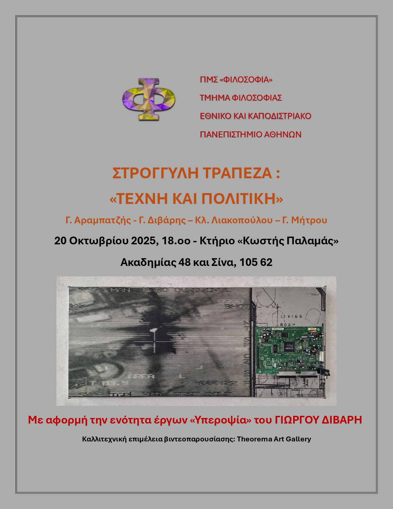 La Galerie Theorema a le plaisir et l’honneur de participer à la table ronde au sujet «Art et politique» organisée par le Programme d” Études de Troisième Cycle du Département de Philosophie de l’Université Nationale et Kapodistrienne d’Athènes, à l’occasion de l’unité d’œuvres « Hyperopsia » de Giorgos Divaris, le 20 octobre 2025 dans le bâtiment «Kostis Palamas» à 18h00.