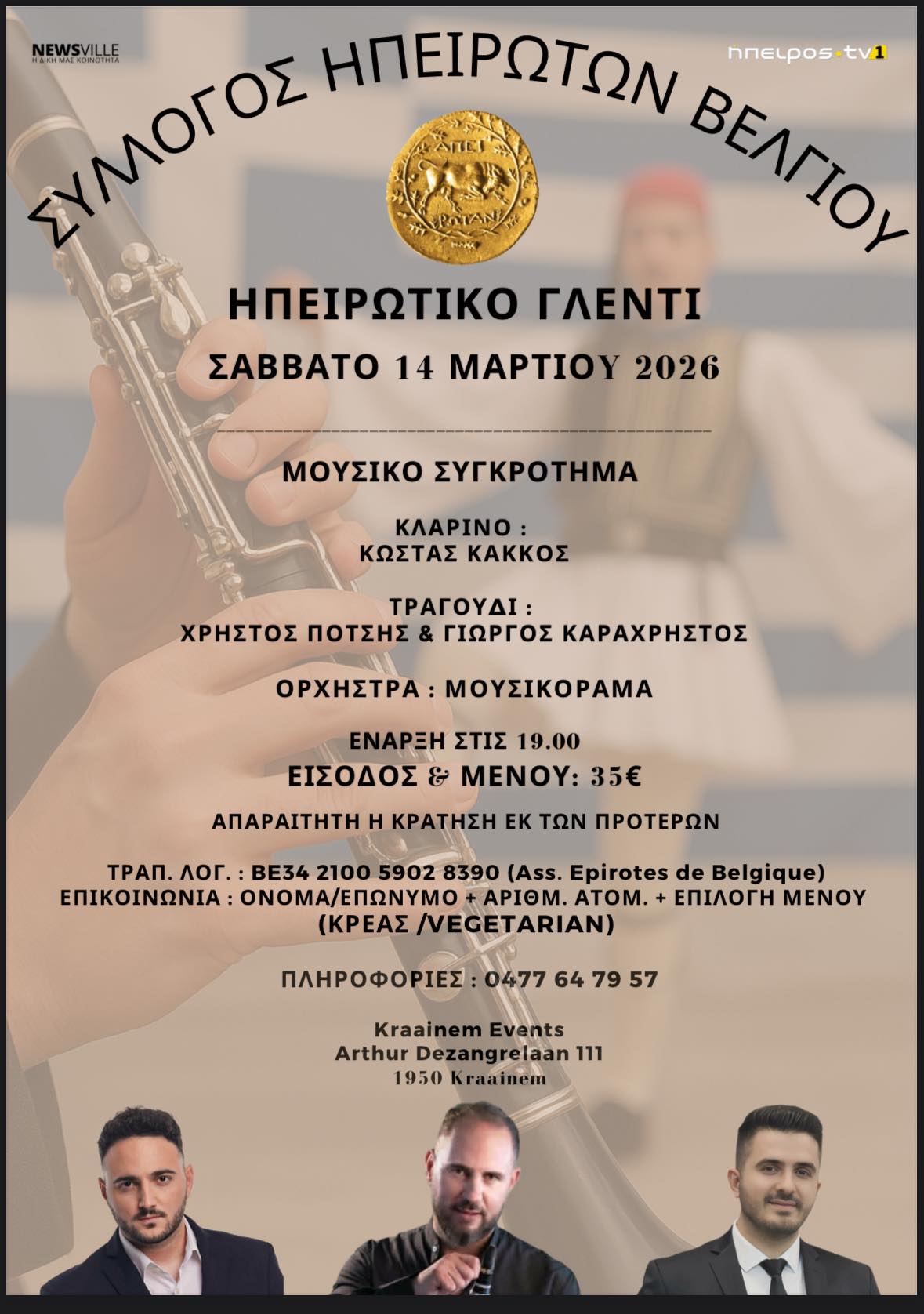 L’Association des Épirotes de Belgique a le plaisir de vous inviter à sa soirée annuelle épirote, une soirée placée sous le signe de la tradition, de la musique live, de la danse et de la convivialité. Le programme musical sera assuré par Kostas Kakkos à la clarinette, avec Christos Pótsis et Giorgos Karachristos au chant, accompagnés par l’orchestre Mousikorama. L’événement aura lieu le samedi 14 mars 2026, avec un début prévu à 19h00, au Kraainem Events, Arthur Dezangrelaan 111, 1950 Kraainem. Le prix d’entrée avec menu est fixé à 35 euros et la réservation préalable est obligatoire. Le paiement et la réservation se font par virement bancaire au IBAN BE34 2100 5902 8390 (Association des Épirotes de Belgique). Lors de votre prise de contact, merci d’indiquer nom et prénom, nombre de personnes ainsi que le choix du menu (viande ou végétarien). Pour toute information complémentaire, vous pouvez contacter le 0477 64 79 57.